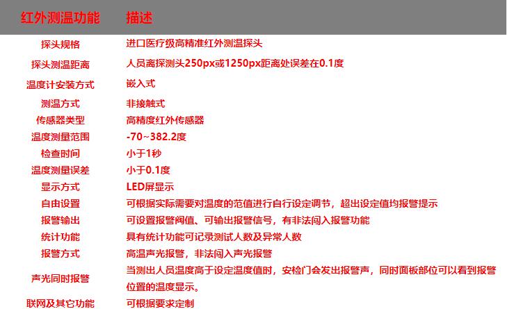 遠距離高精度人體測溫安檢門,集帶人體溫度檢測和金屬探測為一體的安全檢測門,門頭裝有高精度的體溫檢測探頭,探測角度可以上下移動, 能夠測量人體額頭的表面溫度,然后根據(jù)人體額頭的溫度與體溫的關(guān)系得到人體的實際體溫。檢測儀的光學(xué)組件將額頭發(fā)射和反射的能量匯集到傳感器上,通過電子組件將此信息轉(zhuǎn)化成溫度讀數(shù)并顯示在顯示面板上,當(dāng)溫度讀數(shù)超過高溫報警值時,儀器會發(fā)出報警聲.報警溫度可隨意設(shè)置.具有防水、防火、防腐等特點。適用于管制刀具和槍支等危險品的安全檢查,廣泛應(yīng)用于適用于機場,車站,出入境檢查站,等人員密集場所。是防止疫情擴散的有效手段。