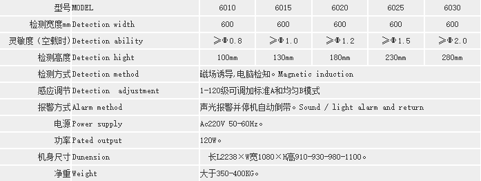 說明:檢針機靈敏度的高低由檢測高度(即通道或龍門)來決定最高檢測精度。龍門越高,靈敏度就相應降低。以上對應的高度和檢測標準是在空機狀態(tài)下的檢測結果;檢測通道高度和寬度,都可以按要求定做!