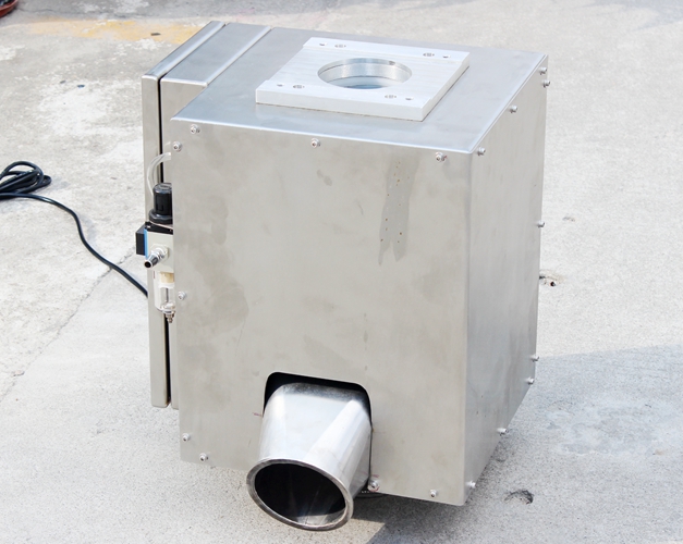 原料從料斗或送料器自由下落進(jìn)入金屬分離器,如果沒有金屬雜質(zhì),原料會直接通過金屬分離器流向下端的出料口。如果檢測器檢測到原料中含有金屬,那么控制器立刻啟動分離板將金屬物和部分原料一起導(dǎo)向側(cè)面的排料口,然后分流板迅速恢復(fù)至正常的位置,分流板速度可調(diào),金屬分離器的檢測精度也可根據(jù)生產(chǎn)需要調(diào)節(jié),最小可檢測并分離出Φ 0.2mm的金屬顆粒。